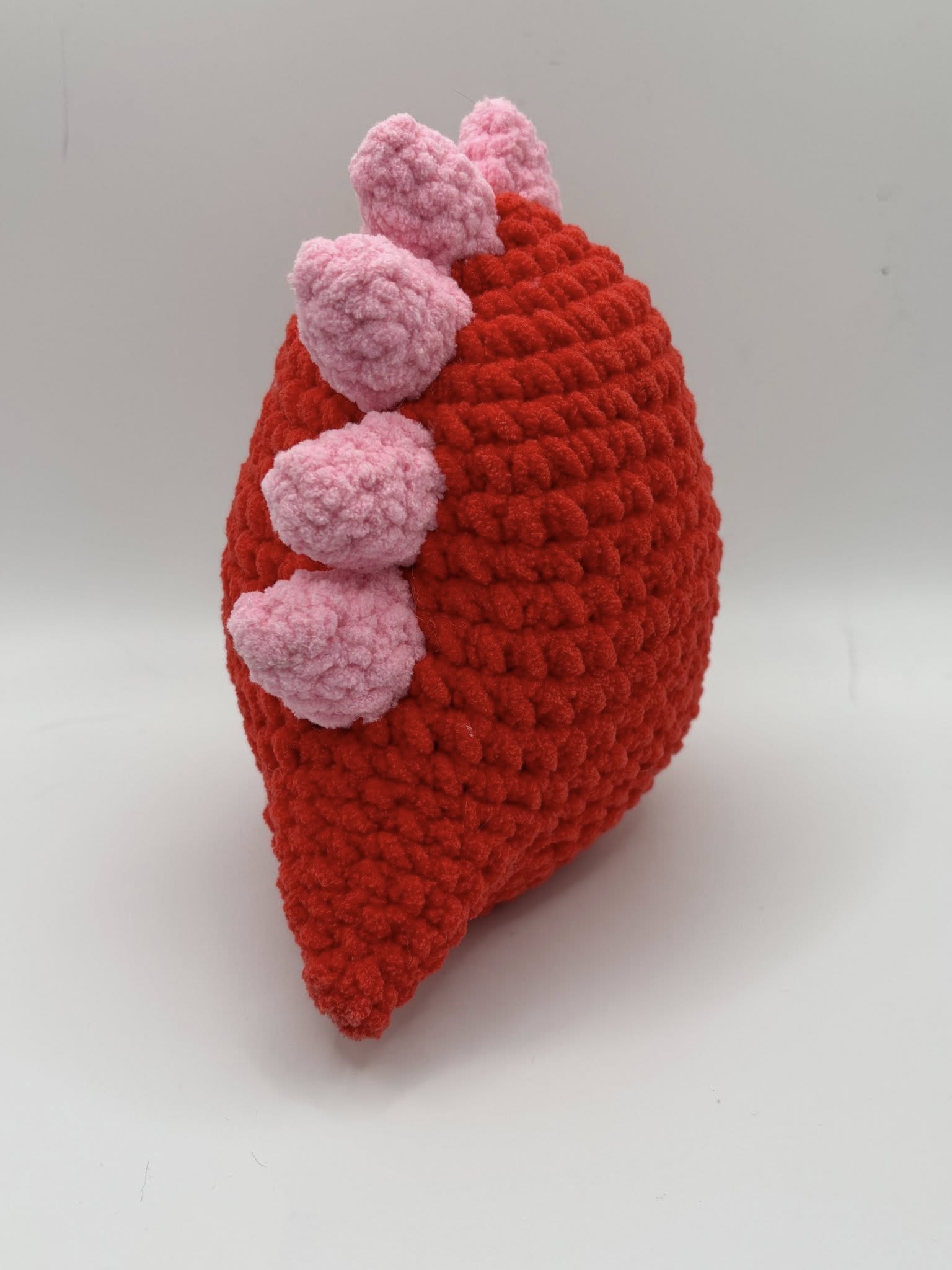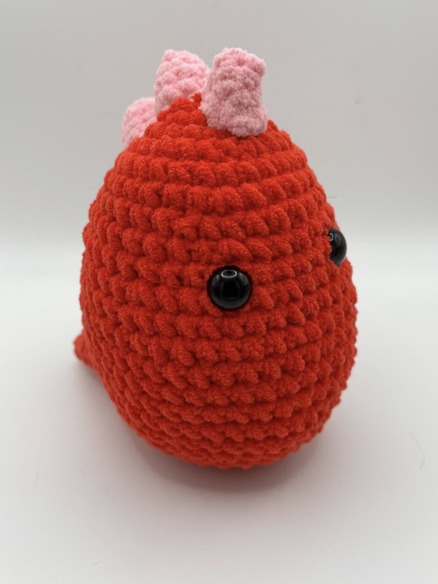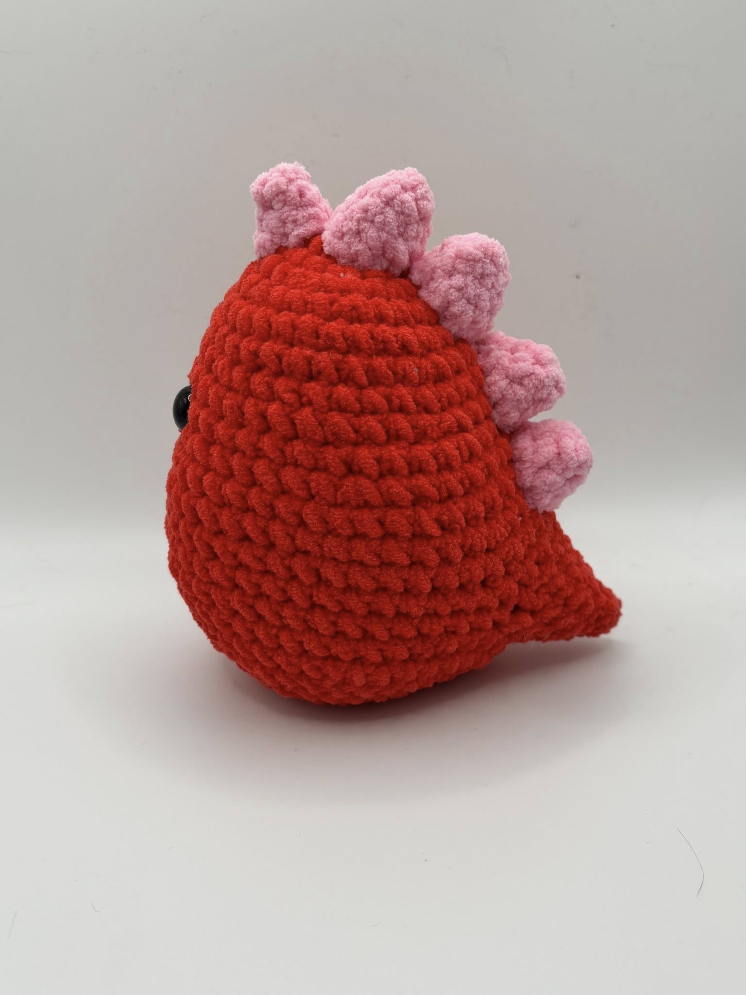 Meet your new cuddly companion! This adorable handmade crochet dinosaur plush is the perfect blend of cute and cozy. Crafted with soft, chunky yarn in vibrant red and topped with pastel pink spikes, this dino is sure to stand out on any shelf, bed, or gift box. Its large, safety eyes give it a charming and expressive look that kids and adults alike will love.